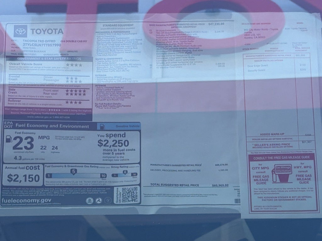 TRD Off Road Premium Package: 3D Multi-Terrain Monitor; Power Tilt/slide Moonroof with Sliding Sunshade; TACOMA Stamped Power Open and Close Tailgate; Auto-Dimming Digital Display Rearview Mirror; Pedestrian Detection; Heated and Ventilated Front Seats; Heated Leather-Trimmed Steering Wheel; Qi-Compatible Wireless Charging; 14" Toyota Audio Multimedia; Power Horizontal Rear Window; Dual Zone Automatic Climate Control; Front and Rear Parking Assist with Automatic Braking; Digital Key Capability; Pre-Wired Auxiliary Switches; AC Power Inverter; SofTex Seat Trim; 8-Way Power Driver and Passenger Seat Adjusters. Towing Technology Package: Towing Hitch; Integrated Trailer Brake Controller. Cross Model Suspension Kit with 2.5" Lift. All Weather Floor Liners. **Equipment listed is based on original vehicle build and subject to change. Please confirm the accuracy of the included equipment by calling the dealer prior to purchase.**