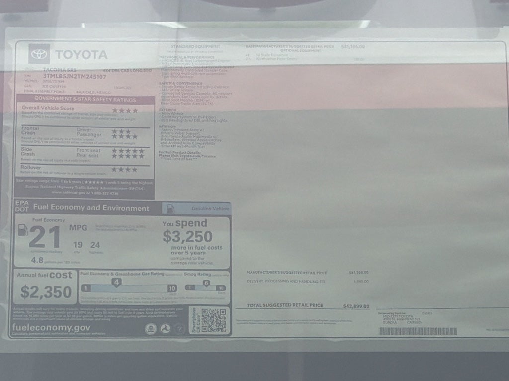 Protect this vehicle from unwanted accidents with a cutting edge backup camera system. This unit comes equipped with Android Auto for seamless smartphone integration on the road. This vehicle features a hands-free Bluetooth® phone system. This model warns of approaching vehicles with Cross-Traffic Alert. This model offers Apple CarPlay for seamless connectivity. Never get into a cold vehicle again with the remote start feature on this Toyota Tacoma. This 2026 Toyota Tacoma 's blind spot monitor enhances safety. This Toyota Tacoma has four wheel drive capabilities. The vehicle shines with clean polished lines coated with an elegant white finish. This small pickup has a 4 Cyl, 2.4L high output engine. This 2026 Toyota Tacoma is equipped with a gasoline engine. Help alleviate lower back pain with the driver seat lumbar support in this Toyota Tacoma. The Toyota Tacoma has fog lights for all weather conditions. Electronic Stability Control is one of many advanced safety features on this unit.